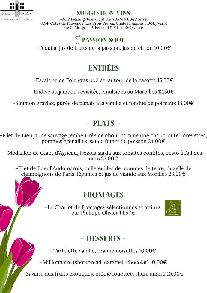 Notre carte évolue au rythme des saisons et des arrivages : travaillant principalement en circuit court avec des produits frais et locaux, certains plats peuvent changer d’un service à l’autre.